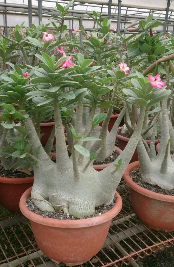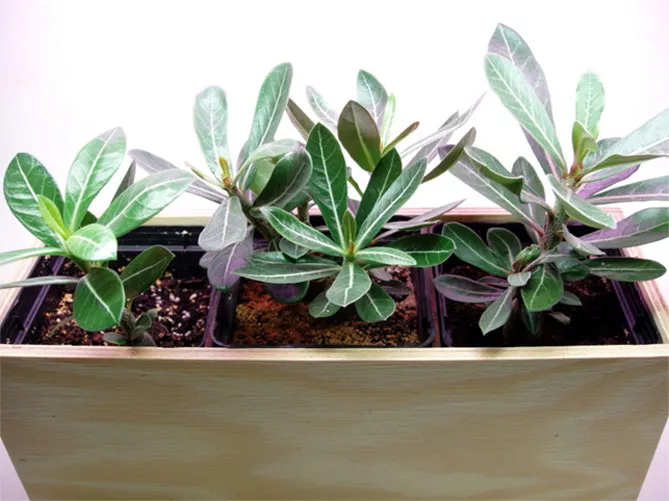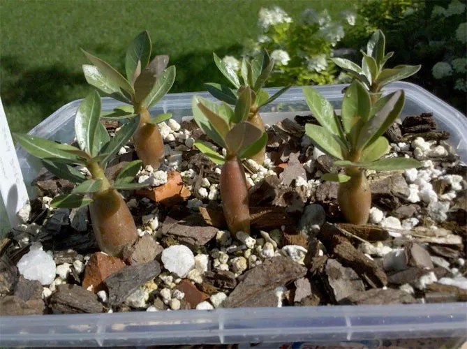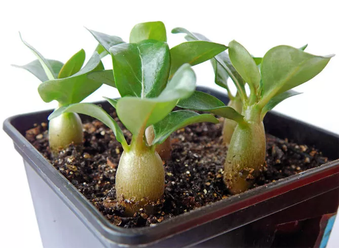 Щоб адениум добре розвивався, слід використовувати невеликі горщики. Можна пересаджувати розсаду в горщики через місяць після появи сходів.