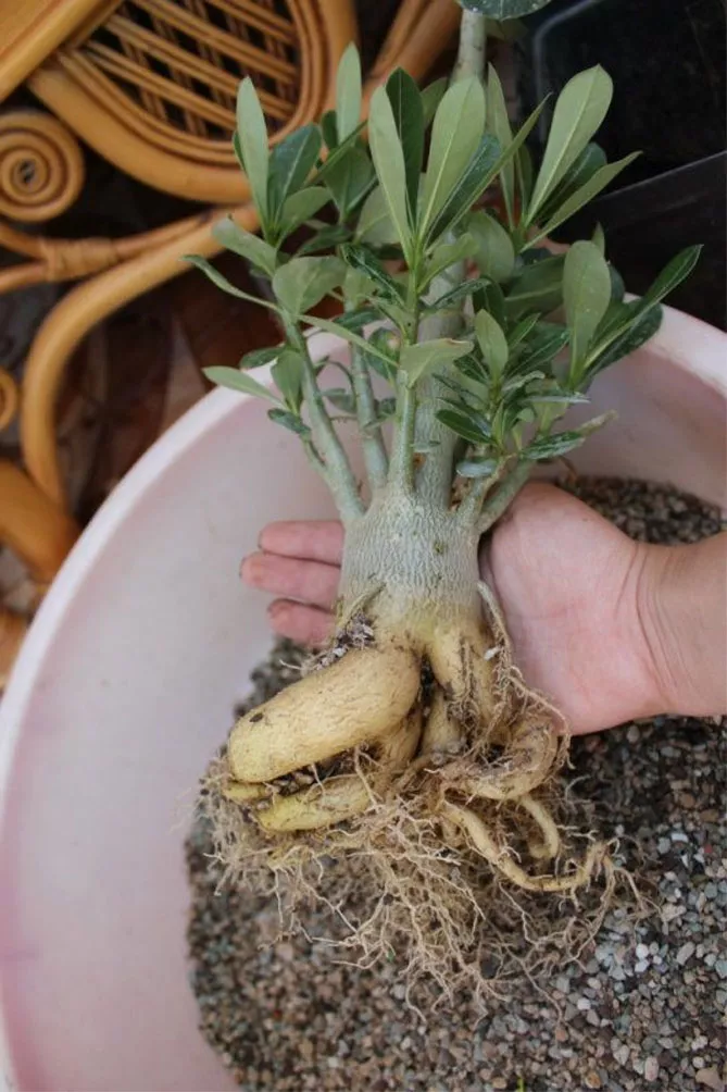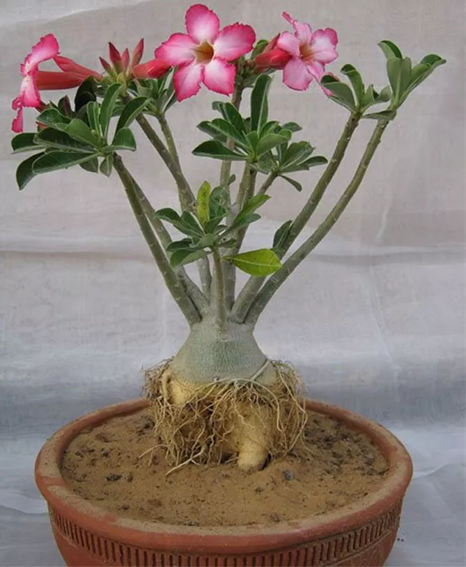 Троянда пустелі родом з Африки. Вона формує стеблокорінь (каудекс) – характерне потовщення біля основи рослини, яке використовується для накопичення води та поживних речовин. Над каудексом утворюються молоді пагони, з яких ростуть квіти.