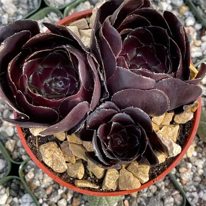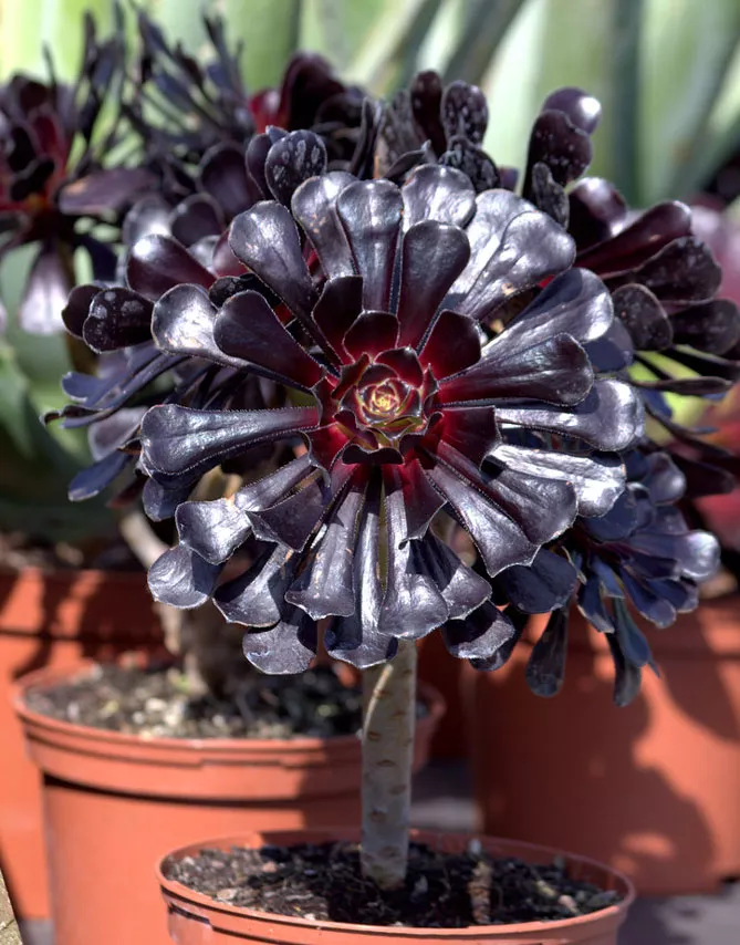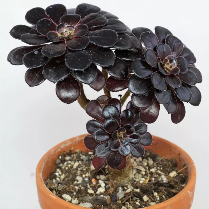 Цікава різновидність – чорна троянда пустелі, зовні трохи відрізняється від класичних видів. Чорний адениум називається Aeonium arboreum, у природі зустрічається на Канарських островах і Мадейрі. На кінцях його пагонів ростуть пишні листя, зібрані у розетки. Квіти мають темний колір.