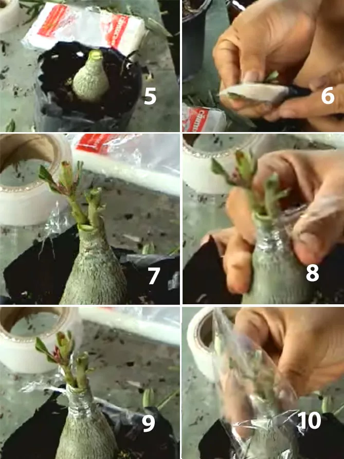 - Зверху надівають невеликий поліетиленовий пакет для підтримки підвищеної вологості. Малюнок 10. Періодично пакетик знімають, провітрюють щеплення. Адениуми зростаються приблизно через 3 тижні, пакетик знімають, плівку розмотують.