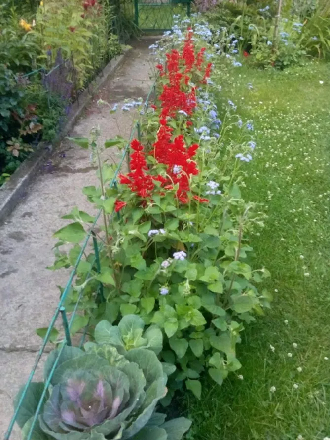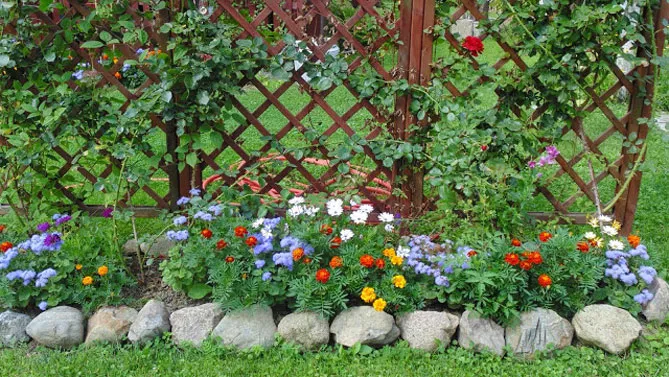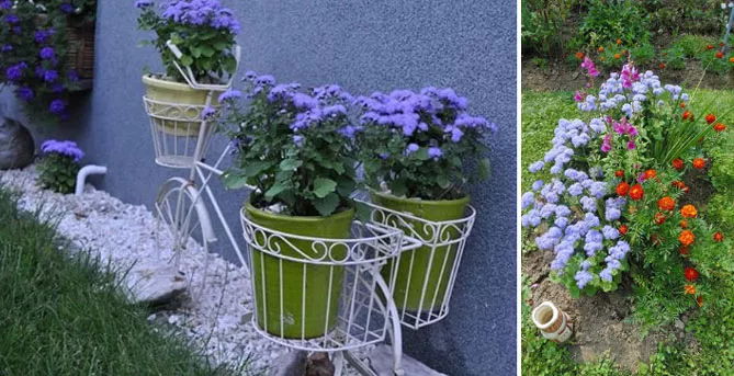 Агератум охоче використовується для створення квіткового килима, у поєднанні з іншими однорічними квітами у контрастних кольорах – жовтому, червоному.