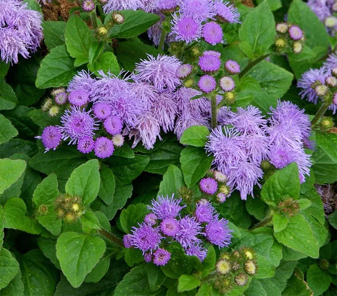 Здавалося б, осінь – це кольори золота, міді чи червоного, але існує безліч блакитних та фіолетових квітів, які чудово поєднуються з жовтневим пейзажем. Наприклад, агератум, чий надзвичайно інтенсивний колір привертає погляд. Квітка дуже популярна, разом з іншими видами однорічних рослин часто висаджується на рабатках, межах клумб. Її можна садити у спеціальні контейнери на терасі, добре росте у горщику. Завдяки невеликим розмірам квітку вирощують на балконі.