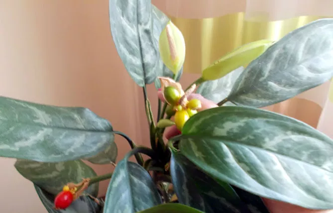 У квартирі аглаонеми іноді квітнуть, вони утворюють досить цікаве суцвіття, яке не має особливих декоративних якостей. Білі чи жовті квіти малопомітні, оточені зеленим листям, збираються у колби, абсолютно без запаху. Іноді рослина плодоносить, формуючи червоні ягоди.