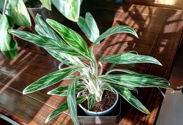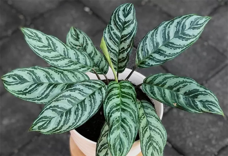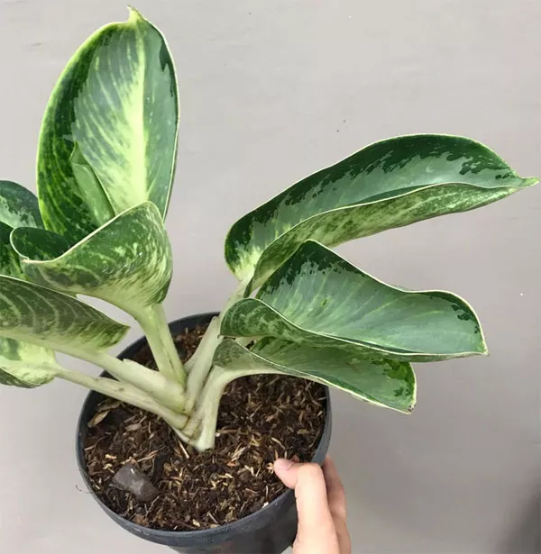 Листки великі, овальні та видовжені, досить товсті та м'ясисті, злегка підняті. Вони трохи нагадують листя дифенбахії, але виглядають привабливіше завдяки декоративним плямам на обох сторонах листової пластинки. Aglaonema дуже декоративна саме через сріблясті смуги, що додають листю привабливості.