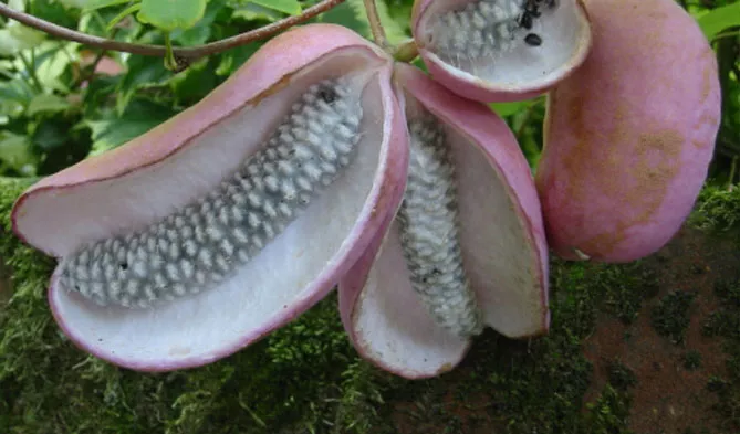 Після теплої весни та літа на запилених жіночих квітах у вересні-жовтні з’являються м’ясисті, опушені плоди. Вони мають незвичайну форму м’ясистих, дугоподібних огірків довжиною 5-8 см, синьо-синіх чи лілових. Дозрілий плід розкривається, оголюючи великі чорні насінини. Ці їстівні плоди, підвішені на кінцях гілок, збирають, коли вони починають розкриватися (у вересні-жовтні), проте вони представляють передусім декоративний інтерес.