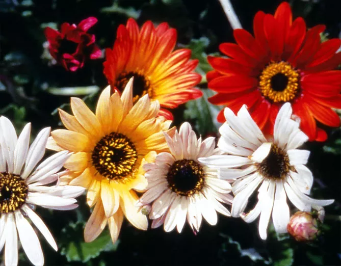 - Квіти – суцвіття мають вигляд кошика, схожі на великі ромашки яскравих, контрастних кольорів – червоні, рожеві, помаранчеві, білі, жовті. Діаметр квітки: 6-12 см, зовнішній вигляд нагадує гацанію (газанію), герберу. Суцвіття розташовані на опушених квітконосах.