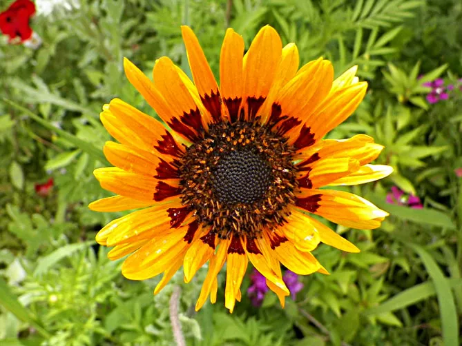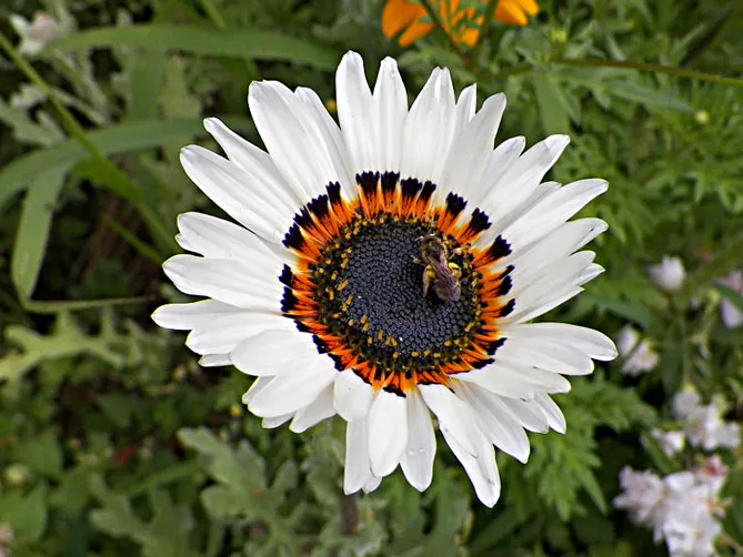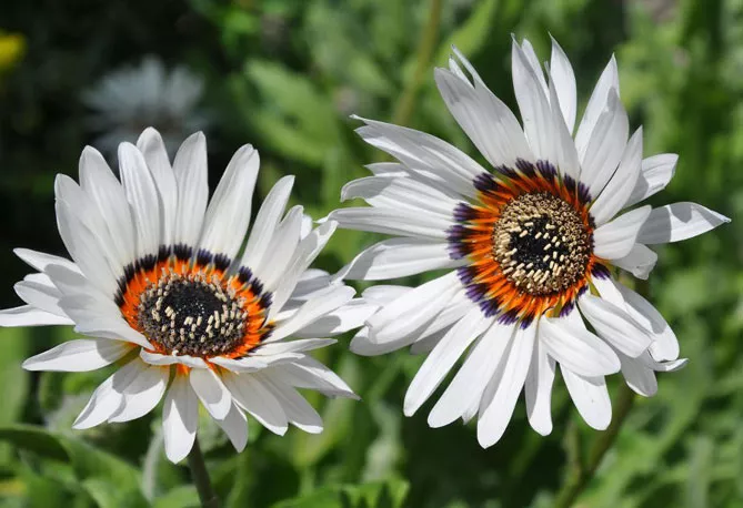 Фото. Популярний сорт даного виду – «Зулуський принц» (Zulu Prince) має білі квітки, чорну серединку-диск, обведену помаранчевими та чорними колами біля основи язичкових квіток.