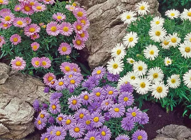 - чагарникові астри (Aster dumosus) – завдяки багатству темно-зелених листків чудово заповнюють вільний простір на рабатках, довго цвітуть, висота зазвичай становить 20-60 см;