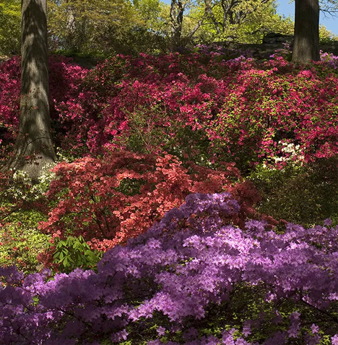 Лише деякі види роду рододендрон походять з Європи, більшість родом з Азії та Північної Америки. Рослини дуже люблять рости в напівтіні. У поєднанні з хвойними деревами як фон ефектне розкішшя квітів азалії справляє ще більше враження.