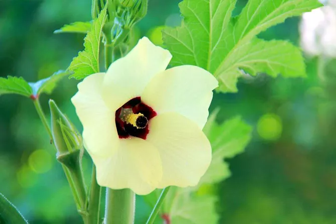 Як і гібіскус, бамія дуже швидко утворює досить високий кущ, вкритий гарною листкою та чудовими жовтими, рожевуватими, з пурпуровою чашечкою квітками.