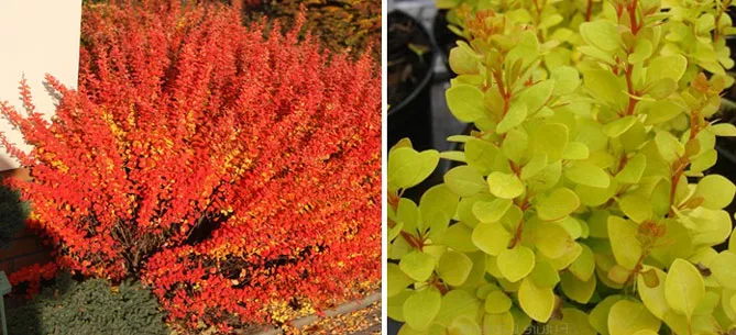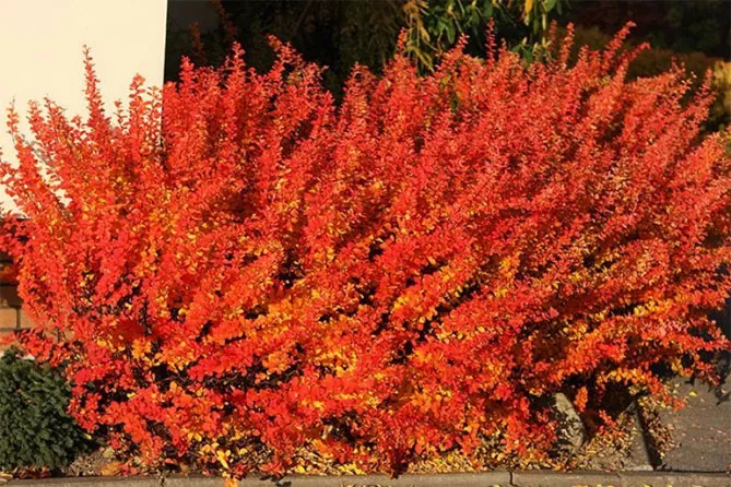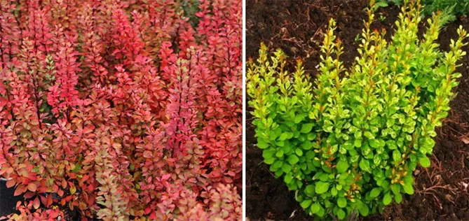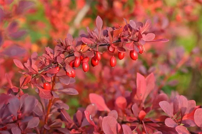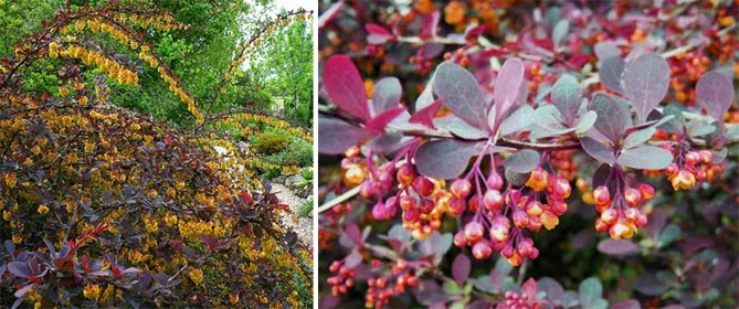 Барбарис виду Тунберга досягає висоти близько 1,5 метра. На додаток до овальних листків, його головна прикраса – подовжені, червоні ягоди. Вид включає величезну кількість декоративних сортів, що значно відрізняються один від одного.