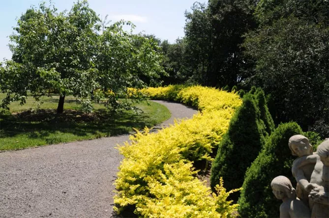 Росте до 1 м у висоту, шириною 1,5 м. Світло-зелені листки перетворюються восени на жовті, алі. Не вимогливий по відношенню до ґрунту і розташування, краще росте у сонячних місцях. Відмінний, стійкий чагарник.