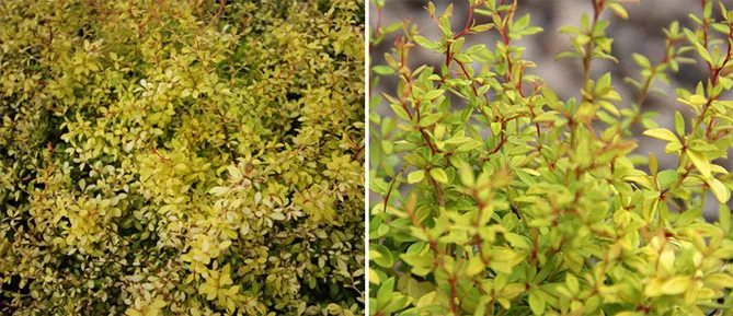 Барбарис виду Тунберг зі сферичною формою досягає максимум висоти 1 метр. Повільноростучий, тернистий і щільний кущ.
