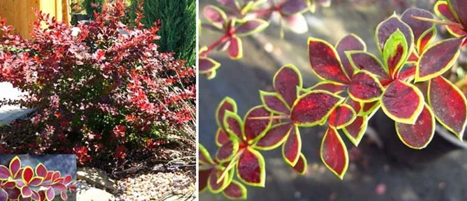 Пурпурнолистий барбарис, росте досить повільно. Фіолетово-червоні листки з зелено-золотим ободком, влітку листя забарвлюється у колір старого золота. Цвіте в кінці травня – початку червня. Віддає перевагу слабокислим ґрунтам.