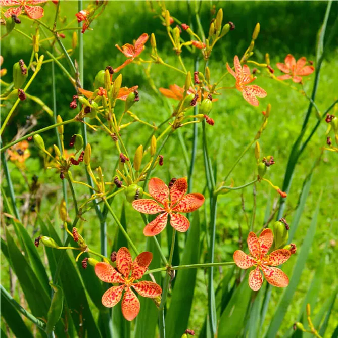 - Гібрид пардаканда Норріса «Канді лілі» (Pardacanda norrisii ‘Candi lily’) має гарні квітки різного забарвлення: фіолетові, оранжеві, жовті, рожеві, що цвітуть з липня по вересень. Висота: 60-90 см, ширина 45 см. Підходить для зрізаних квітів.