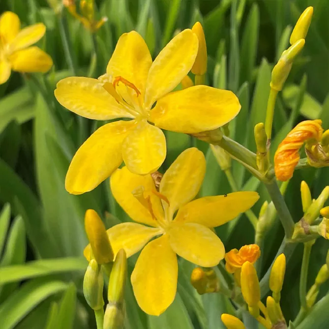 - Беламканда флабелата «Хелло єллоу» (Belamcanda flabellata ‘Hello yellow’) має дрібні яскраво-жовті квітки, що цвітуть з липня по вересень. Дуже рясноцвітучий сорт, висотою 40 см. Для горщиків, клумб, бордюрів та рокаріїв.