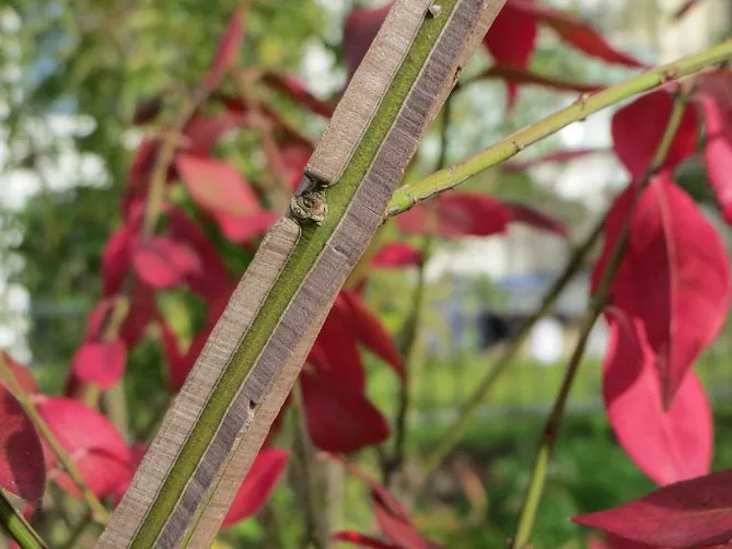 - Пагони. Гілки ростуть горизонтально, мають чотирикутну форму: якщо їх зрізати, переріз буде квадратним. На гранях гілок розташовуються від двох до чотирьох широких наростів, схожих на крила, сформованих із пробки, звідси й назва бересклета цього виду – «крилатий».