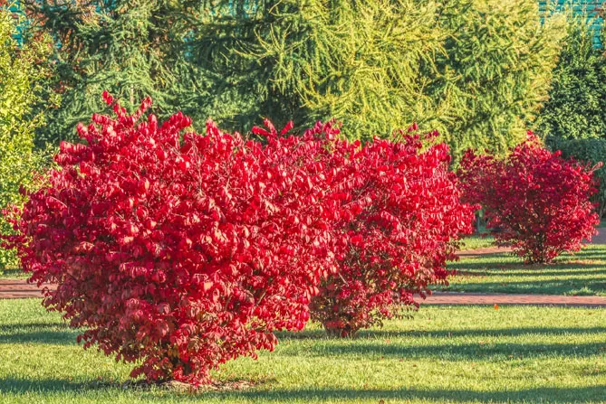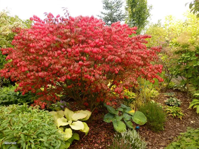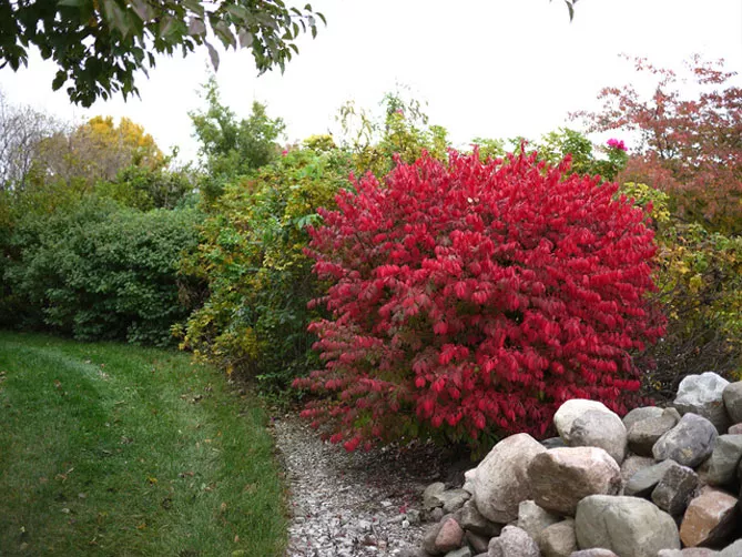 Фото. Бересклет крилатий у ландшафтному дизайні саду – солітер і у вигляді огорожі, у композиціях з іншими рослинами.