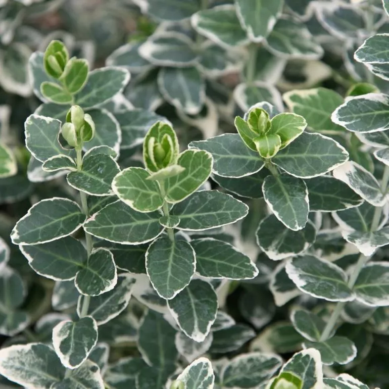 - Emerald Gaiety – сорт має маленьке темно-зелене листя з білою облямівкою. Утворює щільний кущ, килим. Неморозостійкий.