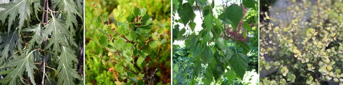 Фото. Листя деяких сортів берези: ‘Crispa’, ‘Betula nana’ – карликовий чагарниковий сорт, ‘Yougii’, Betula nana ‘Golden Treasure’