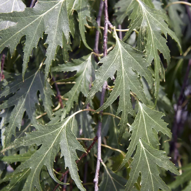 - пурпурове або строкате кремове листя – Betula pendula ‘Royal Frost’, Betula nigra ‘Shiloh Splash’.