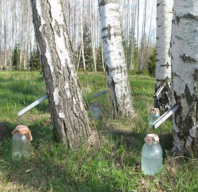 Просвердліть отвір глибиною 3 см свердлом діаметром 6 мм на висоті 1 м від землі. Помістіть 5-літрову ємність біля підніжжя дерева і з'єднайте стовбур з ємністю пластиковою трубкою діаметром 6 мм. Через 12-24 години потрібно замінити контейнер. Припиніть збір, як тільки сік стане білуватим, потім вставте в стовбур дерев'яний штифт, щоб закрити отвір.