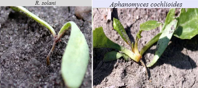 - При зараженні, викликаному грибом Aphanomyces cochlioides, гниття починається з кінчика кореня. Заражений корінь буреє, гниє, руйнується підземна частина, а надземна частина тимчасово залишається здоровою. Листя засихає, але у разі достатньої вологості вони можуть не проявляти ознак хвороби.