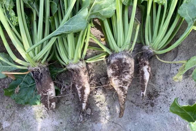 - У разі зараження грибом Rizoctoni solani пошкоджується бічна поверхня кореня. Пошкоджена бічна тканина має темно-синій та чорний колір, глибокі тріщини. Листя в'яне, основи та головка кореня загнивають.