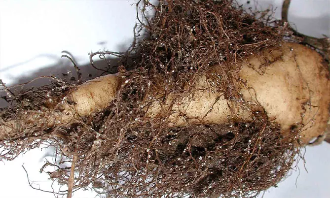 - на корені є велика кількість бічних корінців, що утворюють так звану бороду, на початку захворювання корінь твердий і не проявляє характерної крихкості. На поперечному зрізі видно затемнені провідні судини.