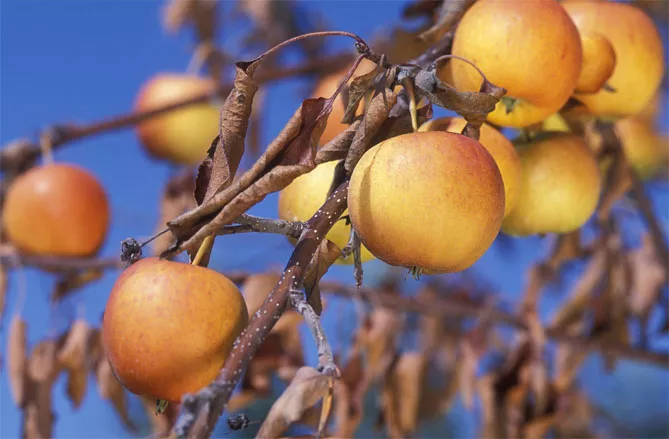 Фото. Бактеріальний опік плодів і листя яблуні