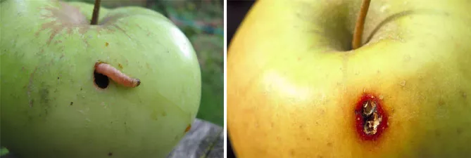 Ще один шкідник, якого легко побачити під час огляду саду – яблунева плодожерка, яка вражає плоди. Шкідник поширений повсюдно, але найбільшу небезпеку представляє в південних регіонах. Найбільш чутливі сорти раннього дозрівання – Мелба, Білий налив та інші і середнього – Кандиль Сінап. Також сильно вражає деякі пізні сорти – Ренет Сіміренко, Ренет Шампанський, Сари Сінап.