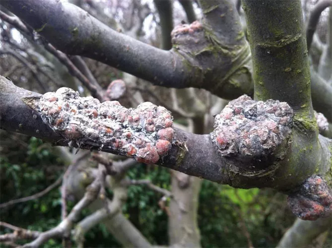 Бактеріальний рак поширюється від заражених бруньок безпосередньо до гілок, потім хвороба вражає стовбур яблуні, призводить до некрозу кори. Вишня, абрикос, черешня, персик, яблуня і груша особливо вразливі для цієї хвороби. В результаті інфекції дерева стають слабкими, гірше протистоять несприятливим факторам, більш чутливі до морозу.