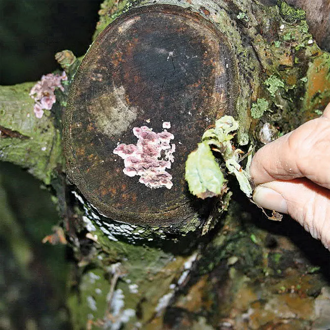 - На останній стадії хвороби виявляються численні плодові тіла, розташовані у вигляді плиток черепиці на зараженому дереві.