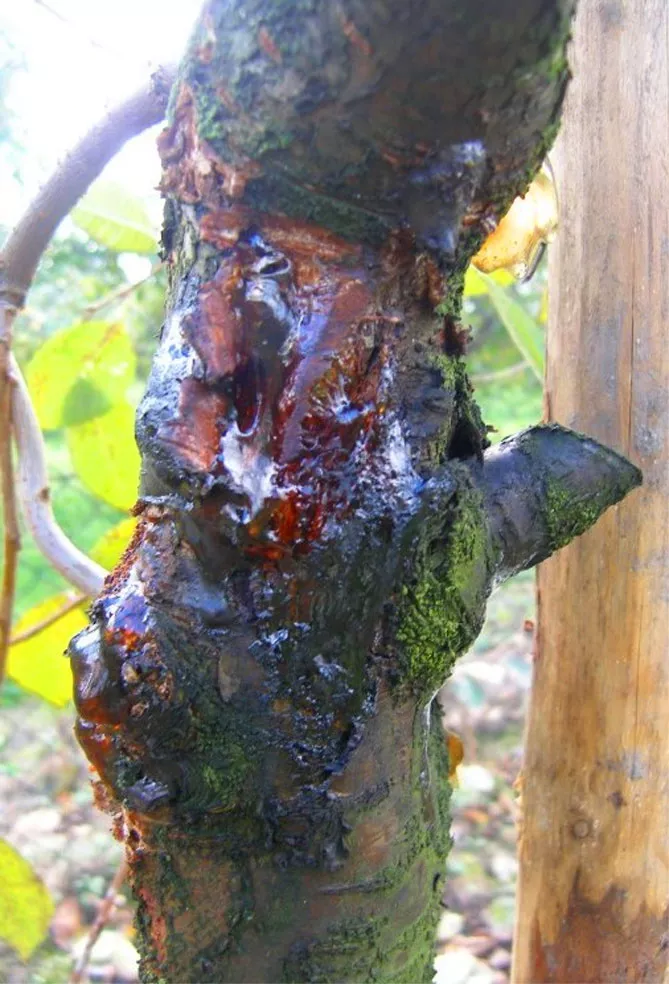 - на пагонах з'являються некротичні плями, після чого формуються потовщені рани зі слизотечею, гілки дерева відмирають.