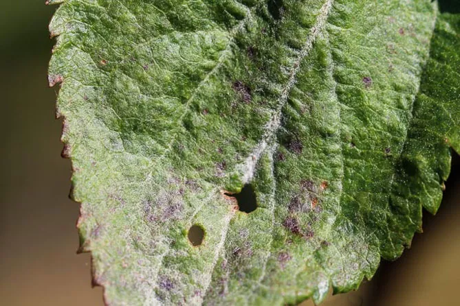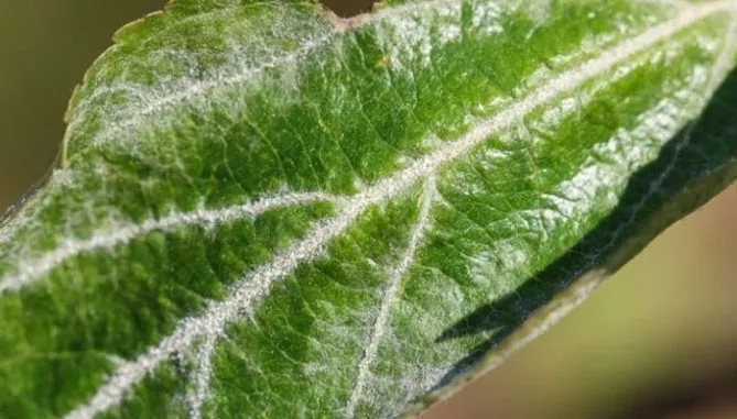 - листя, заражені борошнистою росою, вкриті білим борошнистим нальотом, що складається з міцелію і конидіальних спор гриба;