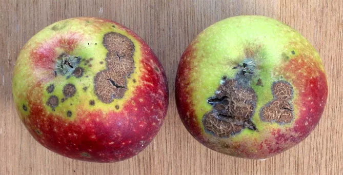 - може вражати ця хвороба плоди яблуні, на яких з'являються гниючі плями, спочатку дрібні, потім збільшуються.