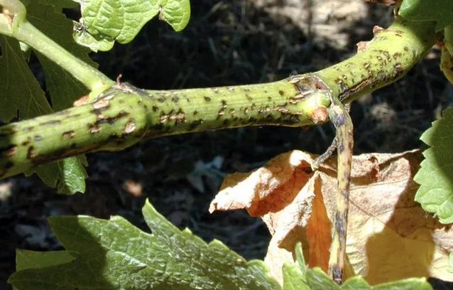 Симптоми антракнозу винограду видно на всіх зелених частинах винограду:
