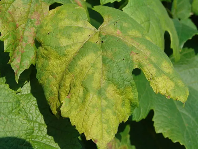 - Пожовтіння листків, що носить певний характер. Листки жовтіють від кінців пагона у напрямку до його основи, чим ближче до основи, тим листки зеленіші. Біля основи стебел винограду забарвлення листових пластинок може бути нормальним. Ця характерна особливість є відмінною рисою залізного хлорозу, що дозволяє відрізняти його від інших причин пожовтіння листків винограду.