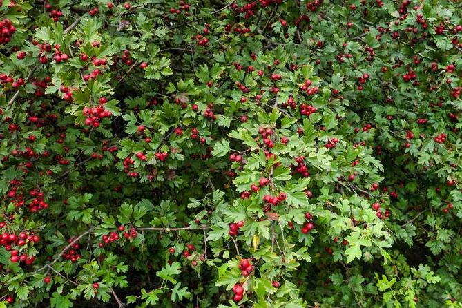 Фото. Приклад рослин для дикого екологічного живоплоту: глід однопестичний, терен (Prunus spinosa), бузина чорна (Sambucus nigra), калина звичайна (Viburnum opulus).