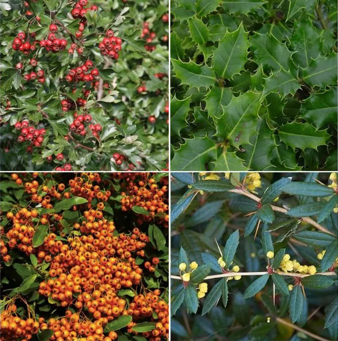 Фото. Приклад рослин для захисного живоплоту: глід однопестичний (Crataegus monogyna), падуб гостролистий (Ilex aquifolium), піраканта «Оранж Глоу» (Pyracantha ‘Orange Glow’), барбарис Юліани (Berberis julianae).