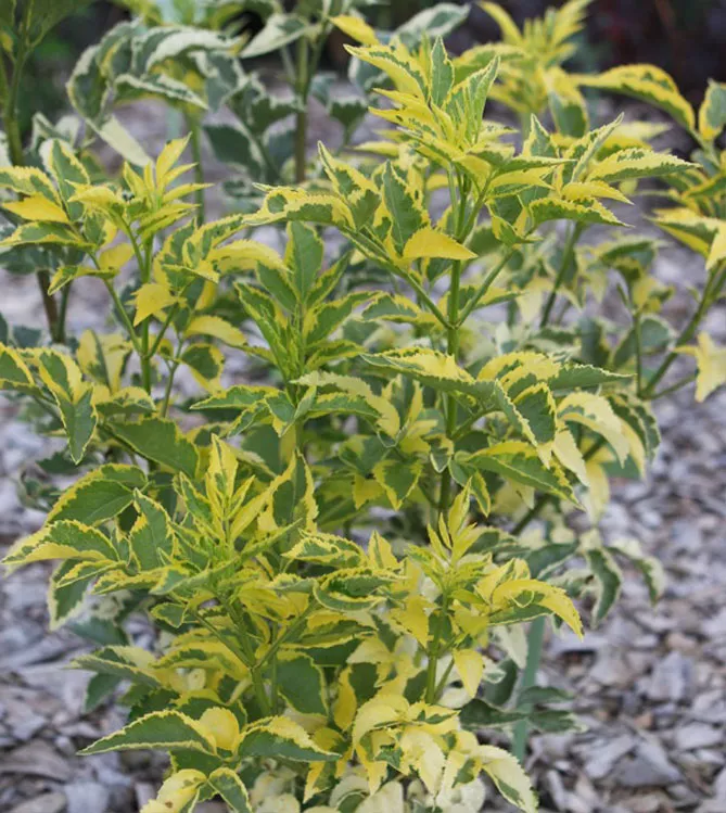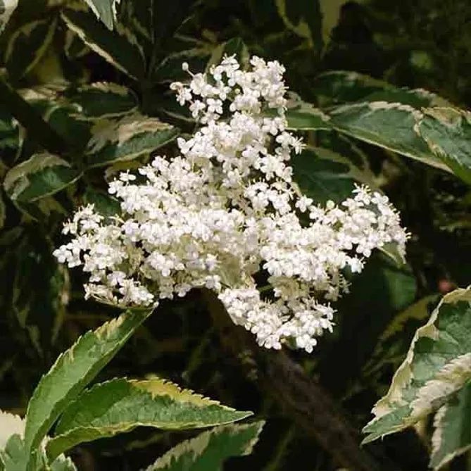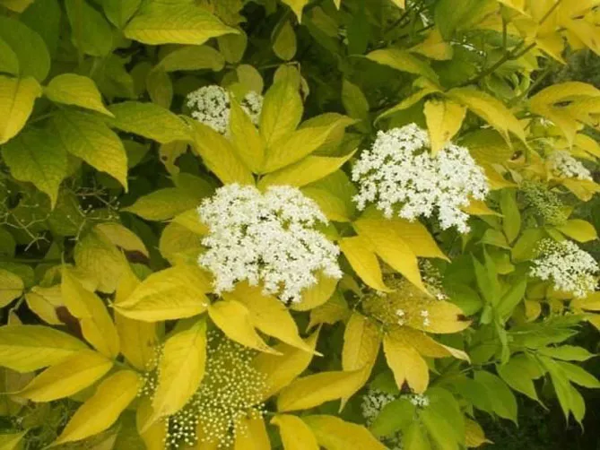 Дуже яскравий строкатий сорт бузини «Мадонна» (Sambucus nigra ‘Madonna’) цвіте з травня по червень. Висота у зрілості – 2,5 м. Прикрасить сад темно-зеленим листям з жовтими строкатими плямами, яке освітить темні місця в саду.