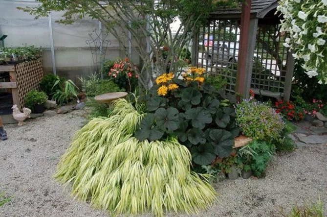 Бузульник тангутський (Ligularia tangutica) принесе багато зелені у напівтінисті куточки, особливо у ті, де переважає вода. Вид походить із Китаю і є багаторічною рослиною родини айстрових, яка за сприятливих умов стає навіть інвазивною. Виростає до півтора метра у висоту, іноді вище. Має декоративні, подовжені, зелені листки, квітки зібрані у пірамідальні жовті суцвіття. Цвіте у другій половині літа – на початку осені. Вимагає напівтінистих ділянок, вологих родючих і перегнойованих ґрунтів. Повністю морозостійкий.