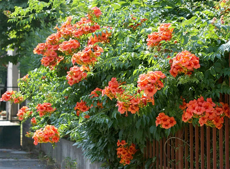 Великоквітковий кампсис – виючий квітучий чагарник висотою до 10 метрів, вирощується в південних регіонах. Росте пишно, щороку збільшується на 2-4 метри. Розцвітає в кінці літа, восени (серпень-вересень). Декоративні квітки довжиною 5-7 см залежно від сорту бувають різних кольорів:
