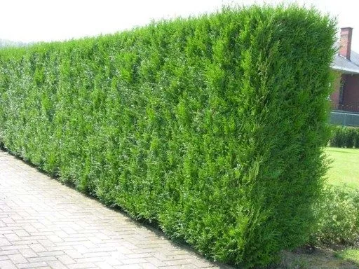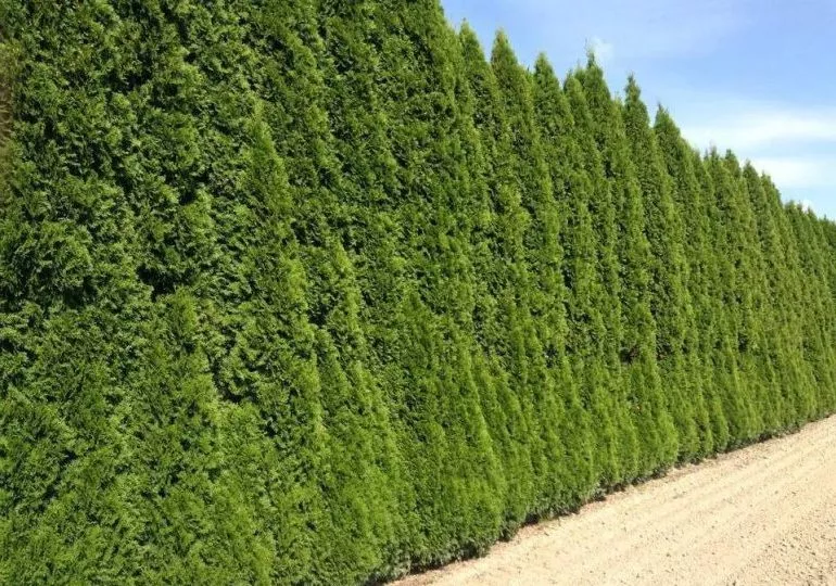 Дуже швидко росте західна туя. Цей високорослий вид чудово переносить розташування з сонячної чи тінистої сторони, тому виглядає однаково добре по всій довжині огорожі. Туя не викликає проблем взимку, популярна в кліматичних зонах, де потрібні морозостійкі рослини.