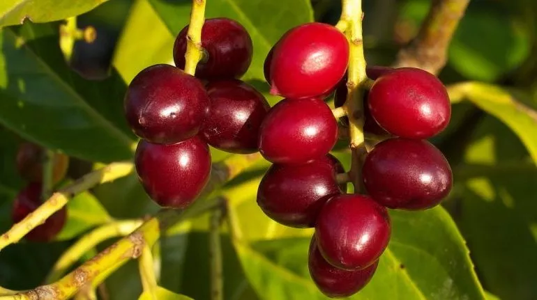 Плоди з'являються в жовтні, спочатку червоні або темно-фіолетові, потім чорні сферичні ягоди до 1 см у діаметрі. Ягоди дозрівають у серпні, опадають досить швидко.