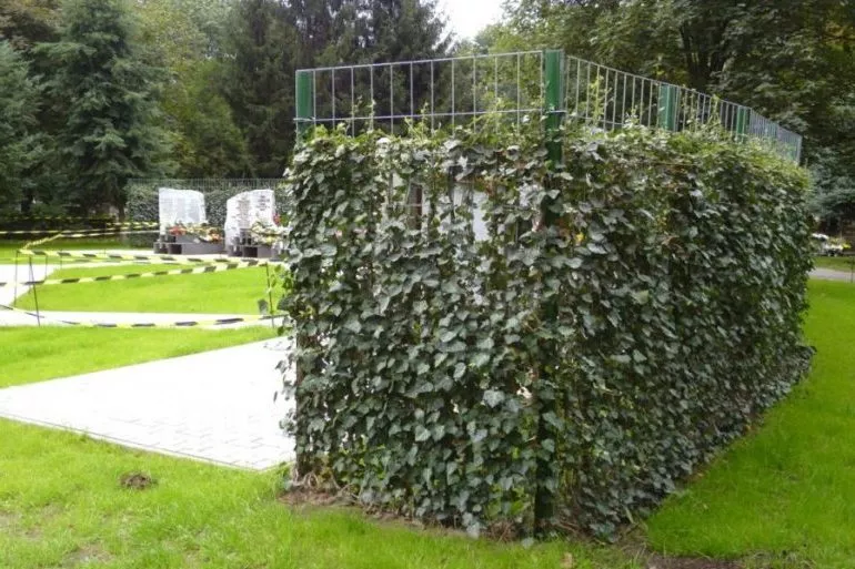 Замість будівництва цегляної, кам'яної стіни можна вибрати металеву сітчасту огорожу, натягнуту між стовпами, заплітаючи її плющем.