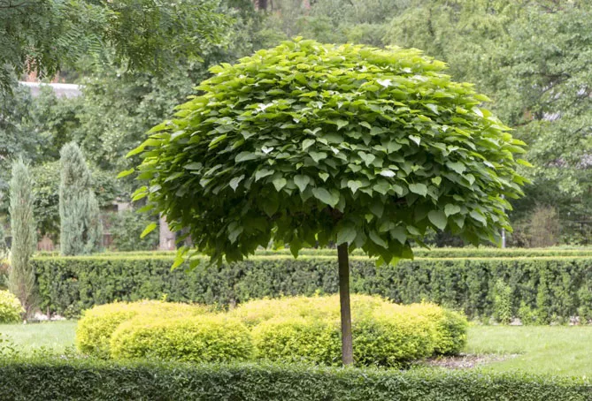 Звичайна або бігнонієвидна катальпа (Catalpa bignonioides) досягає висоти 10-20 м. Це швидкоросле дерево заслуговує на увагу. При посадці катальпи потрібно виділити багато місця – її крона може досягати діаметра 8 м. Катальпа любить добре освітлені місця. Для невеликих садів рекомендується сорт «Нана», який зазвичай продається у вигляді щепленої рослини. Кругла крона катальпи нагадує парасольку, виглядає сучасно. Плодові тіла, схожі на стручки квасолі, що звисають з дерева, надають рослині екзотичного характеру.