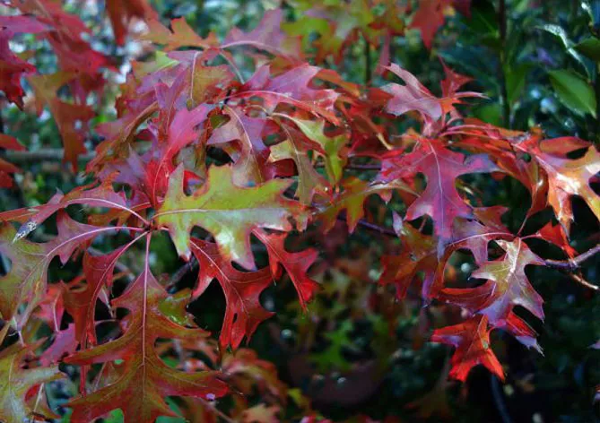 Швидкорослий дуб болотяний (Quercus palustris) ширококонічної форми з направленими вниз гілками виростає на 30 см щорічно. Еліптичні, глибоко розсічені зелені листки восени стають темно-червоними або коричневими.