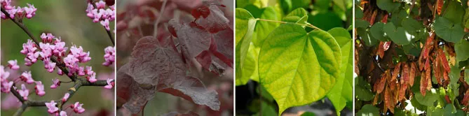 Фото. Квіти C. siliquastrum, пурпурна листва C. canadensis ‘Forest Pansy’, зеленувато-жовта листва C. chinensis ‘Avondale’ (Megan Hansen), плоди C. siliquastrum (Tatters)