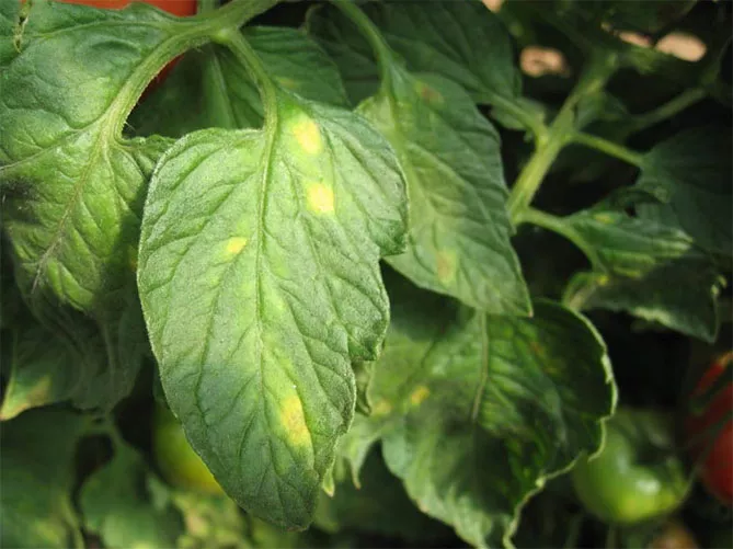 - Жовті плями на листі помідорів у теплиці можуть утворюватися через ураження кущів грибковими хворобами. Грибкова інфекція здатна проникнути у тканини з необеззаражених насінин, ґрунту, з добривами. При захворюваннях фузаріозом або антракнозом листики втрачають тургор навіть у рослин, що ростуть на вологому ґрунті. Щоб уникнути подібних захворювань, рекомендується удобрювати ґрунт на томатних ділянках, проводити профілактичні обробки. Хворі рослини можна обприскати будь-яким фунгіцидом, що містить мідь.